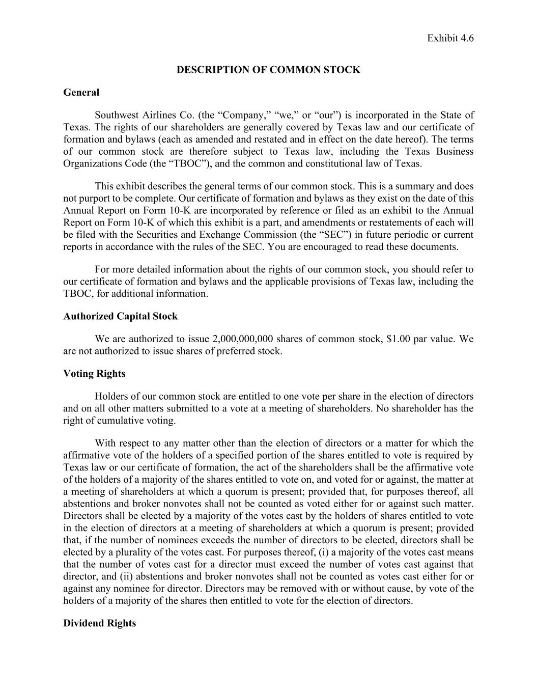 Exhibit 4.6 DESCRIPTION OF COMMON STOCK General Southwest Airlines Co. (the “Company,” “we,” or “our”) is incorporated in the State of Texas. The rights of our shareholders are generally covered by Texas law and our certificate of formation and bylaws (each as amended and restated and in effect on the date hereof). The terms of our common stock are therefore subject to Texas law, including the Texas Business Organizations Code (the “TBOC”), and the common and constitutional law of Texas. This exhibit describes the general terms of our common stock. This is a summary and does not purport to be complete. Our certificate of formation and bylaws as they exist on the date of this Annual Report on Form 10-K are incorporated by reference or filed as an exhibit to the Annual Report on Form 10-K of which this exhibit is a part, and amendments or restatements of each will be filed with the Securities and Exchange Commission (the “SEC”) in future periodic or current reports in accordance with the rules of the SEC. You are encouraged to read these documents. For more detailed information about the rights of our common stock, you should refer to our certificate of formation and bylaws and the applicable provisions of Texas law, including the TBOC, for additional information. Authorized Capital Stock We are authorized to issue 2,000,000,000 shares of common stock, $1.00 par value. We are not authorized to issue shares of preferred stock. Voting Rights Holders of our common stock are entitled to one vote per share in the election of directors and on all other matters submitted to a vote at a meeting of shareholders. No shareholder has the right of cumulative voting. With respect to any matter other than the election of directors or a matter for which the affirmative vote of the holders of a specified portion of the shares entitled to vote is required by Texas law or our certificate of formation, the act of the shareholders shall be the affirmative vote of the holders of a majority of the shares entitled to vote on, and voted for or against, the matter at a meeting of shareholders at which a quorum is present; provided that, for purposes thereof, all abstentions and broker nonvotes shall not be counted as voted either for or against such matter. Directors shall be elected by a majority of the votes cast by the holders of shares entitled to vote in the election of directors at a meeting of shareholders at which a quorum is present; provided that, if the number of nominees exceeds the number of directors to be elected, directors shall be elected by a plurality of the votes cast. For purposes thereof, (i) a majority of the votes cast means that the number of votes cast for a director must exceed the number of votes cast against that director, and (ii) abstentions and broker nonvotes shall not be counted as votes cast either for or against any nominee for director. Directors may be removed with or without cause, by vote of the holders of a majority of the shares then entitled to vote for the election of directors. Dividend Rights