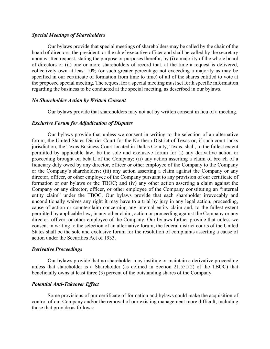 Special Meetings of Shareholders Our bylaws provide that special meetings of shareholders may be called by the chair of the board of directors, the president, or the chief executive officer and shall be called by the secretary upon written request, stating the purpose or purposes therefor, by (i) a majority of the whole board of directors or (ii) one or more shareholders of record that, at the time a request is delivered, collectively own at least 10% (or such greater percentage not exceeding a majority as may be specified in our certificate of formation from time to time) of all of the shares entitled to vote at the proposed special meeting. The request for a special meeting must set forth specific information regarding the business to be conducted at the special meeting, as described in our bylaws. No Shareholder Action by Written Consent Our bylaws provide that shareholders may not act by written consent in lieu of a meeting. Exclusive Forum for Adjudication of Disputes Our bylaws provide that unless we consent in writing to the selection of an alternative forum, the United States District Court for the Northern District of Texas or, if such court lacks jurisdiction, the Texas Business Court located in Dallas County, Texas, shall, to the fullest extent permitted by applicable law, be the sole and exclusive forum for (i) any derivative action or proceeding brought on behalf of the Company; (ii) any action asserting a claim of breach of a fiduciary duty owed by any director, officer or other employee of the Company to the Company or the Company’s shareholders; (iii) any action asserting a claim against the Company or any director, officer, or other employee of the Company pursuant to any provision of our certificate of formation or our bylaws or the TBOC; and (iv) any other action asserting a claim against the Company or any director, officer, or other employee of the Company constituting an “internal entity claim” under the TBOC. Our bylaws provide that each shareholder irrevocably and unconditionally waives any right it may have to a trial by jury in any legal action, proceeding, cause of action or counterclaim concerning any internal entity claim and, to the fullest extent permitted by applicable law, in any other claim, action or proceeding against the Company or any director, officer, or other employee of the Company. Our bylaws further provide that unless we consent in writing to the selection of an alternative forum, the federal district courts of the United States shall be the sole and exclusive forum for the resolution of complaints asserting a cause of action under the Securities Act of 1933. Derivative Proceedings Our bylaws provide that no shareholder may institute or maintain a derivative proceeding unless that shareholder is a Shareholder (as defined in Section 21.551(2) of the TBOC) that beneficially owns at least three (3) percent of the outstanding shares of the Company. Potential Anti-Takeover Effect Some provisions of our certificate of formation and bylaws could make the acquisition of control of our Company and/or the removal of our existing management more difficult, including those that provide as follows: