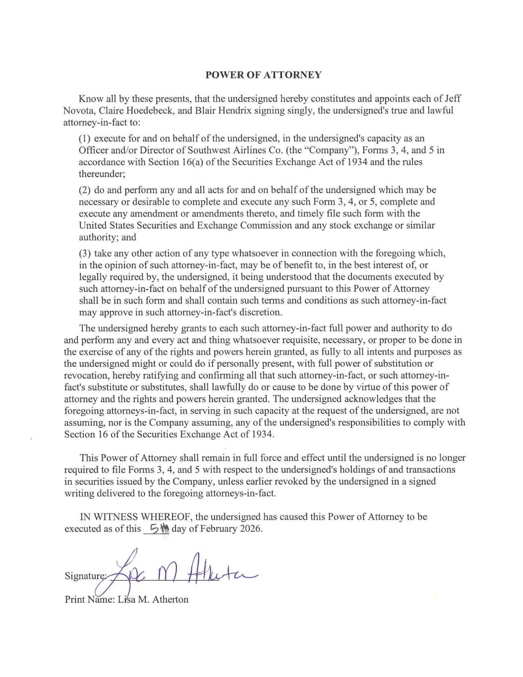 POWER OF ATTORNEY Know all by these presents, that the undersigned hereby constitutes and appoints each of Jeff Novota, Claire Hoedebeck, and Blair Hendrix signing singly, the undersigned's true and lawful attorney-in-fact to: (1) execute for and on behalf of the undersigned, in the undersigned's capacity as an Officer and/or Director of Southwest Airlines Co. (the "Company"), Forms 3, 4, and 5 in accordance with Section 16(a) of the Securities Exchange Act of 1934 and the rules thereunder; (2) do and perform any and all acts for and on behalf of the undersigned which may be necessary or desirable to complete and execute any such Form 3, 4, or 5, complete and execute any amendment or amendments thereto, and timely file such form with the United States Securities and Exchange Commission and any stock exchange or similar authority; and (3) take any other action of any type whatsoever in connection with the foregoing which, in the opinion of such attorney-in-fact, may be of benefit to, in the best interest of, or legally required by, the undersigned, it being understood that the documents executed by such attorney-in-fact on behalf of the undersigned pursuant to this Power of Attorney shall be in such form and shall contain such terms and conditions as such attorney-in-fact may approve in such attorney-in-fact's discretion. The undersigned hereby grants to each such attorney-in-fact full power and authority to do and perform any and every act and thing whatsoever requisite, necessary, or proper to be done in the exercise of any of the rights and powers herein granted, as fully to all intents and purposes as the undersigned might or could do if personally present, with full power of substitution or revocation, hereby ratifying and confirming all that such attorney-in-fact, or such attorney-in- fact's substitute or substitutes, shall lawfully do or cause to be done by virtue of this power of attorney and the rights and powers herein granted. The undersigned acknowledges that the foregoing attorneys-in-fact, in serving in such capacity at the request of the undersigned, are not assuming, nor is the Company assuming, any of the undersigned's responsibilities to comply with Section 16 of the Securities Exchange Act of 1934. This Power of Attorney shall remain in full force and effect until the undersigned is no longer required to file Forms 3, 4, and 5 with respect to the undersigned's holdings of and transactions in securities issued by the Company, unless earlier revoked by the undersigned in a signed writing delivered to the foregoing attorneys-in-fact. IN WITNESS WHEREOF, the undersigned has caused this Power of Attorney to be executed as of this day of February 2026. Signature. Print Name: L sa M. Atherton