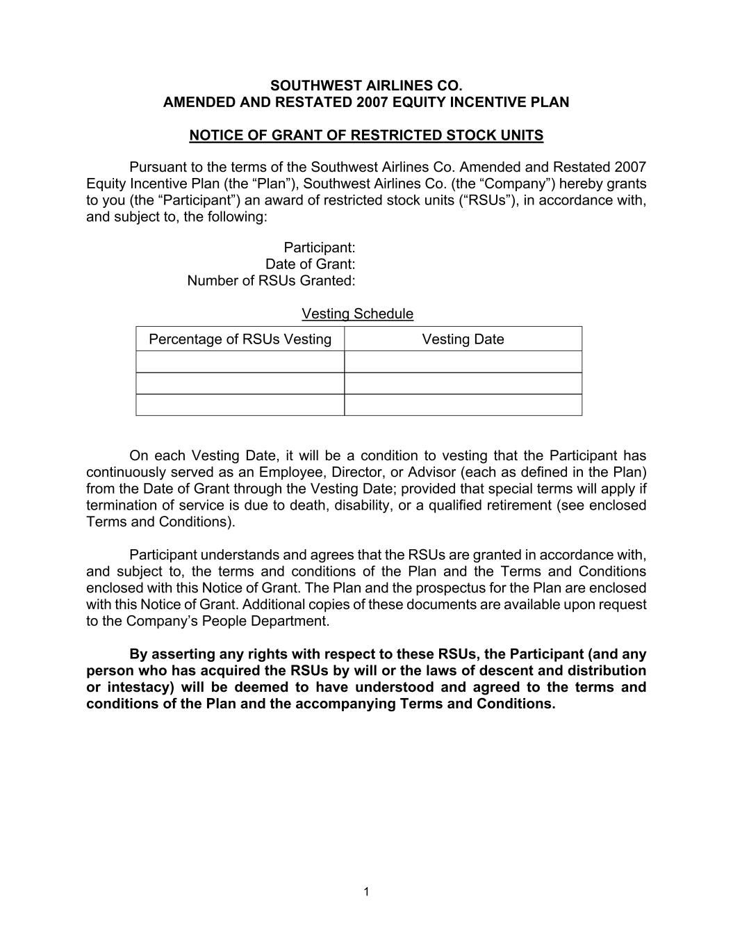 1 SOUTHWEST AIRLINES CO. AMENDED AND RESTATED 2007 EQUITY INCENTIVE PLAN NOTICE OF GRANT OF RESTRICTED STOCK UNITS Pursuant to the terms of the Southwest Airlines Co. Amended and Restated 2007 Equity Incentive Plan (the “Plan”), Southwest Airlines Co. (the “Company”) hereby grants to you (the “Participant”) an award of restricted stock units (“RSUs”), in accordance with, and subject to, the following: Participant: Date of Grant: Number of RSUs Granted: Vesting Schedule Percentage of RSUs Vesting Vesting Date On each Vesting Date, it will be a condition to vesting that the Participant has continuously served as an Employee, Director, or Advisor (each as defined in the Plan) from the Date of Grant through the Vesting Date; provided that special terms will apply if termination of service is due to death, disability, or a qualified retirement (see enclosed Terms and Conditions). Participant understands and agrees that the RSUs are granted in accordance with, and subject to, the terms and conditions of the Plan and the Terms and Conditions enclosed with this Notice of Grant. The Plan and the prospectus for the Plan are enclosed with this Notice of Grant. Additional copies of these documents are available upon request to the Company’s People Department. By asserting any rights with respect to these RSUs, the Participant (and any person who has acquired the RSUs by will or the laws of descent and distribution or intestacy) will be deemed to have understood and agreed to the terms and conditions of the Plan and the accompanying Terms and Conditions.