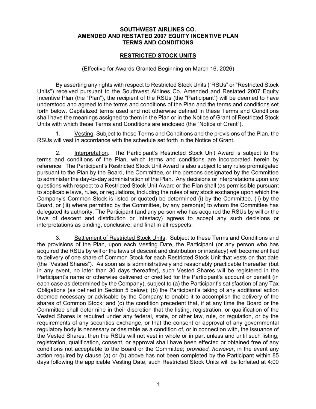 1 SOUTHWEST AIRLINES CO. AMENDED AND RESTATED 2007 EQUITY INCENTIVE PLAN TERMS AND CONDITIONS RESTRICTED STOCK UNITS (Effective for Awards Granted Beginning on March 16, 2026) By asserting any rights with respect to Restricted Stock Units (“RSUs” or “Restricted Stock Units”) received pursuant to the Southwest Airlines Co. Amended and Restated 2007 Equity Incentive Plan (the “Plan”), the recipient of the RSUs (the “Participant”) will be deemed to have understood and agreed to the terms and conditions of the Plan and the terms and conditions set forth below. Capitalized terms used and not otherwise defined in these Terms and Conditions shall have the meanings assigned to them in the Plan or in the Notice of Grant of Restricted Stock Units with which these Terms and Conditions are enclosed (the “Notice of Grant”). 1. Vesting. Subject to these Terms and Conditions and the provisions of the Plan, the RSUs will vest in accordance with the schedule set forth in the Notice of Grant. 2. Interpretation. The Participant’s Restricted Stock Unit Award is subject to the terms and conditions of the Plan, which terms and conditions are incorporated herein by reference. The Participant’s Restricted Stock Unit Award is also subject to any rules promulgated pursuant to the Plan by the Board, the Committee, or the persons designated by the Committee to administer the day-to-day administration of the Plan. Any decisions or interpretations upon any questions with respect to a Restricted Stock Unit Award or the Plan shall (as permissible pursuant to applicable laws, rules, or regulations, including the rules of any stock exchange upon which the Company’s Common Stock is listed or quoted) be determined (i) by the Committee, (ii) by the Board, or (iii) where permitted by the Committee, by any person(s) to whom the Committee has delegated its authority. The Participant (and any person who has acquired the RSUs by will or the laws of descent and distribution or intestacy) agrees to accept any such decisions or interpretations as binding, conclusive, and final in all respects. 3. Settlement of Restricted Stock Units. Subject to these Terms and Conditions and the provisions of the Plan, upon each Vesting Date, the Participant (or any person who has acquired the RSUs by will or the laws of descent and distribution or intestacy) will become entitled to delivery of one share of Common Stock for each Restricted Stock Unit that vests on that date (the “Vested Shares”). As soon as is administratively and reasonably practicable thereafter (but in any event, no later than 30 days thereafter), such Vested Shares will be registered in the Participant’s name or otherwise delivered or credited for the Participant’s account or benefit (in each case as determined by the Company), subject to (a) the Participant’s satisfaction of any Tax Obligations (as defined in Section 5 below); (b) the Participant’s taking of any additional action deemed necessary or advisable by the Company to enable it to accomplish the delivery of the shares of Common Stock; and (c) the condition precedent that, if at any time the Board or the Committee shall determine in their discretion that the listing, registration, or qualification of the Vested Shares is required under any federal, state, or other law, rule, or regulation, or by the requirements of any securities exchange, or that the consent or approval of any governmental regulatory body is necessary or desirable as a condition of, or in connection with, the issuance of the Vested Shares, then the RSUs will not vest in whole or in part unless and until such listing, registration, qualification, consent, or approval shall have been effected or obtained free of any conditions not acceptable to the Board or the Committee; provided, however, in the event any action required by clause (a) or (b) above has not been completed by the Participant within 85 days following the applicable Vesting Date, such Restricted Stock Units will be forfeited at 4:00
