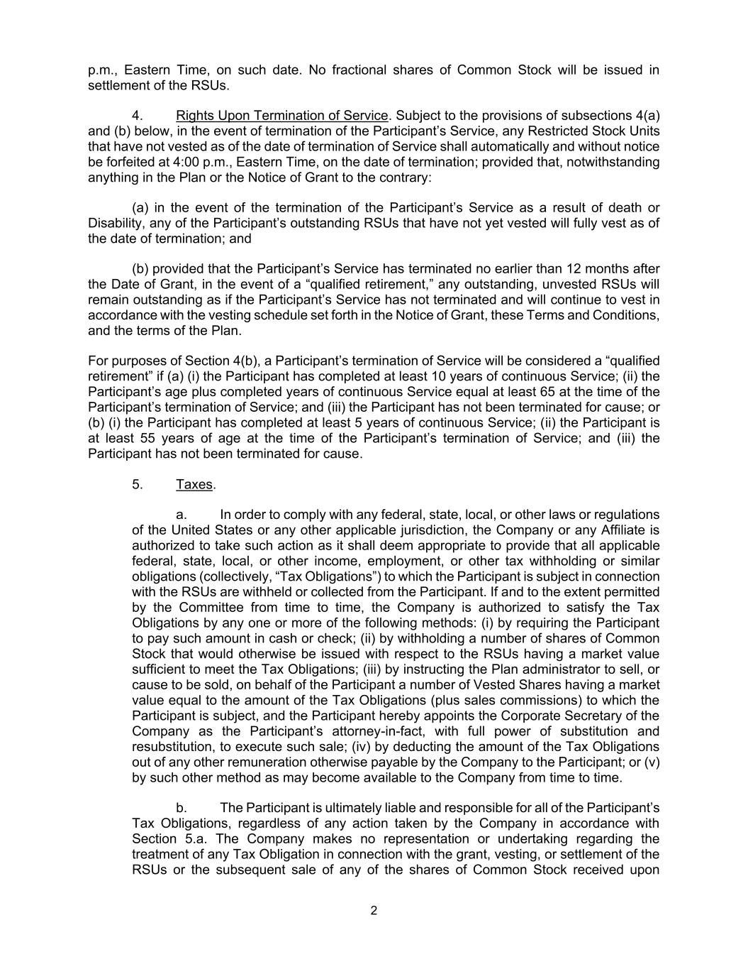 2 p.m., Eastern Time, on such date. No fractional shares of Common Stock will be issued in settlement of the RSUs. 4. Rights Upon Termination of Service. Subject to the provisions of subsections 4(a) and (b) below, in the event of termination of the Participant’s Service, any Restricted Stock Units that have not vested as of the date of termination of Service shall automatically and without notice be forfeited at 4:00 p.m., Eastern Time, on the date of termination; provided that, notwithstanding anything in the Plan or the Notice of Grant to the contrary: (a) in the event of the termination of the Participant’s Service as a result of death or Disability, any of the Participant’s outstanding RSUs that have not yet vested will fully vest as of the date of termination; and (b) provided that the Participant’s Service has terminated no earlier than 12 months after the Date of Grant, in the event of a “qualified retirement,” any outstanding, unvested RSUs will remain outstanding as if the Participant’s Service has not terminated and will continue to vest in accordance with the vesting schedule set forth in the Notice of Grant, these Terms and Conditions, and the terms of the Plan. For purposes of Section 4(b), a Participant’s termination of Service will be considered a “qualified retirement” if (a) (i) the Participant has completed at least 10 years of continuous Service; (ii) the Participant’s age plus completed years of continuous Service equal at least 65 at the time of the Participant’s termination of Service; and (iii) the Participant has not been terminated for cause; or (b) (i) the Participant has completed at least 5 years of continuous Service; (ii) the Participant is at least 55 years of age at the time of the Participant’s termination of Service; and (iii) the Participant has not been terminated for cause. 5. Taxes. a. In order to comply with any federal, state, local, or other laws or regulations of the United States or any other applicable jurisdiction, the Company or any Affiliate is authorized to take such action as it shall deem appropriate to provide that all applicable federal, state, local, or other income, employment, or other tax withholding or similar obligations (collectively, “Tax Obligations”) to which the Participant is subject in connection with the RSUs are withheld or collected from the Participant. If and to the extent permitted by the Committee from time to time, the Company is authorized to satisfy the Tax Obligations by any one or more of the following methods: (i) by requiring the Participant to pay such amount in cash or check; (ii) by withholding a number of shares of Common Stock that would otherwise be issued with respect to the RSUs having a market value sufficient to meet the Tax Obligations; (iii) by instructing the Plan administrator to sell, or cause to be sold, on behalf of the Participant a number of Vested Shares having a market value equal to the amount of the Tax Obligations (plus sales commissions) to which the Participant is subject, and the Participant hereby appoints the Corporate Secretary of the Company as the Participant’s attorney-in-fact, with full power of substitution and resubstitution, to execute such sale; (iv) by deducting the amount of the Tax Obligations out of any other remuneration otherwise payable by the Company to the Participant; or (v) by such other method as may become available to the Company from time to time. b. The Participant is ultimately liable and responsible for all of the Participant’s Tax Obligations, regardless of any action taken by the Company in accordance with Section 5.a. The Company makes no representation or undertaking regarding the treatment of any Tax Obligation in connection with the grant, vesting, or settlement of the RSUs or the subsequent sale of any of the shares of Common Stock received upon
