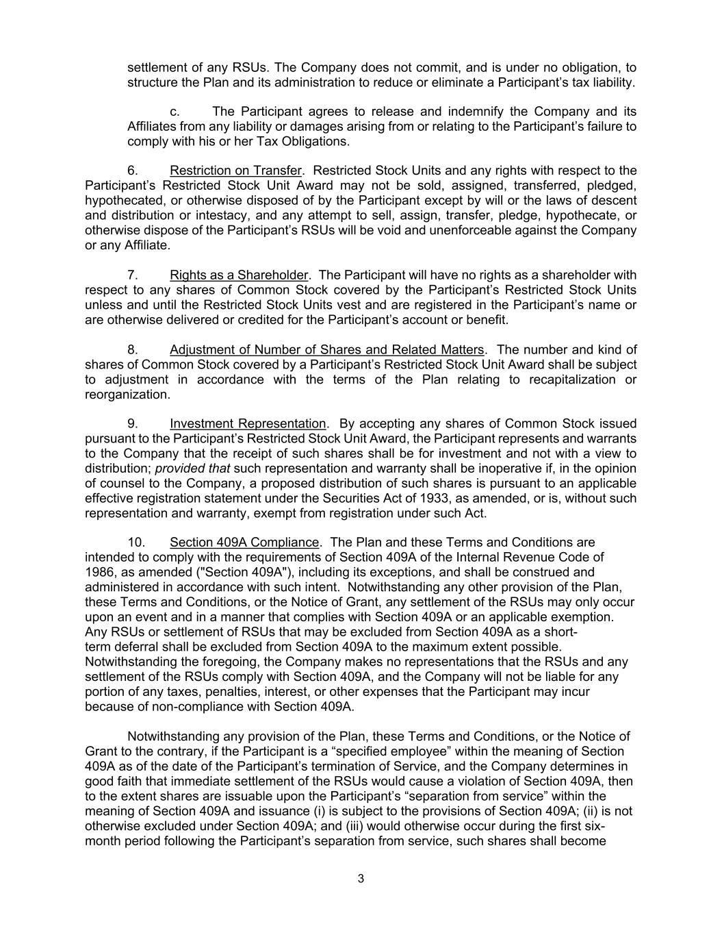 3 settlement of any RSUs. The Company does not commit, and is under no obligation, to structure the Plan and its administration to reduce or eliminate a Participant’s tax liability. c. The Participant agrees to release and indemnify the Company and its Affiliates from any liability or damages arising from or relating to the Participant’s failure to comply with his or her Tax Obligations. 6. Restriction on Transfer. Restricted Stock Units and any rights with respect to the Participant’s Restricted Stock Unit Award may not be sold, assigned, transferred, pledged, hypothecated, or otherwise disposed of by the Participant except by will or the laws of descent and distribution or intestacy, and any attempt to sell, assign, transfer, pledge, hypothecate, or otherwise dispose of the Participant’s RSUs will be void and unenforceable against the Company or any Affiliate. 7. Rights as a Shareholder. The Participant will have no rights as a shareholder with respect to any shares of Common Stock covered by the Participant’s Restricted Stock Units unless and until the Restricted Stock Units vest and are registered in the Participant’s name or are otherwise delivered or credited for the Participant’s account or benefit. 8. Adjustment of Number of Shares and Related Matters. The number and kind of shares of Common Stock covered by a Participant’s Restricted Stock Unit Award shall be subject to adjustment in accordance with the terms of the Plan relating to recapitalization or reorganization. 9. Investment Representation. By accepting any shares of Common Stock issued pursuant to the Participant’s Restricted Stock Unit Award, the Participant represents and warrants to the Company that the receipt of such shares shall be for investment and not with a view to distribution; provided that such representation and warranty shall be inoperative if, in the opinion of counsel to the Company, a proposed distribution of such shares is pursuant to an applicable effective registration statement under the Securities Act of 1933, as amended, or is, without such representation and warranty, exempt from registration under such Act. 10. Section 409A Compliance. The Plan and these Terms and Conditions are intended to comply with the requirements of Section 409A of the Internal Revenue Code of 1986, as amended ("Section 409A"), including its exceptions, and shall be construed and administered in accordance with such intent. Notwithstanding any other provision of the Plan, these Terms and Conditions, or the Notice of Grant, any settlement of the RSUs may only occur upon an event and in a manner that complies with Section 409A or an applicable exemption. Any RSUs or settlement of RSUs that may be excluded from Section 409A as a short- term deferral shall be excluded from Section 409A to the maximum extent possible. Notwithstanding the foregoing, the Company makes no representations that the RSUs and any settlement of the RSUs comply with Section 409A, and the Company will not be liable for any portion of any taxes, penalties, interest, or other expenses that the Participant may incur because of non-compliance with Section 409A. Notwithstanding any provision of the Plan, these Terms and Conditions, or the Notice of Grant to the contrary, if the Participant is a “specified employee” within the meaning of Section 409A as of the date of the Participant’s termination of Service, and the Company determines in good faith that immediate settlement of the RSUs would cause a violation of Section 409A, then to the extent shares are issuable upon the Participant’s “separation from service” within the meaning of Section 409A and issuance (i) is subject to the provisions of Section 409A; (ii) is not otherwise excluded under Section 409A; and (iii) would otherwise occur during the first six- month period following the Participant’s separation from service, such shares shall become