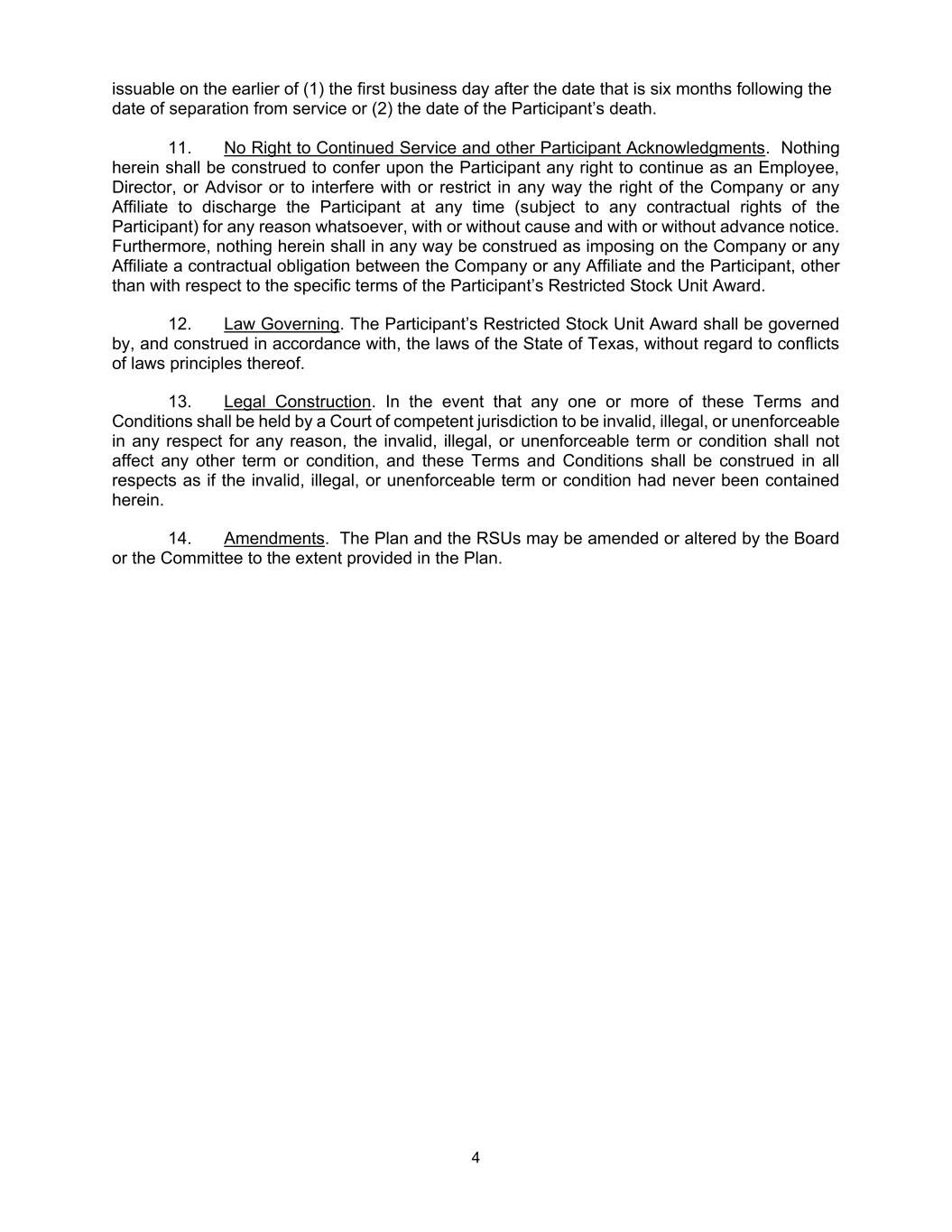 4 issuable on the earlier of (1) the first business day after the date that is six months following the date of separation from service or (2) the date of the Participant’s death. 11. No Right to Continued Service and other Participant Acknowledgments. Nothing herein shall be construed to confer upon the Participant any right to continue as an Employee, Director, or Advisor or to interfere with or restrict in any way the right of the Company or any Affiliate to discharge the Participant at any time (subject to any contractual rights of the Participant) for any reason whatsoever, with or without cause and with or without advance notice. Furthermore, nothing herein shall in any way be construed as imposing on the Company or any Affiliate a contractual obligation between the Company or any Affiliate and the Participant, other than with respect to the specific terms of the Participant’s Restricted Stock Unit Award. 12. Law Governing. The Participant’s Restricted Stock Unit Award shall be governed by, and construed in accordance with, the laws of the State of Texas, without regard to conflicts of laws principles thereof. 13. Legal Construction. In the event that any one or more of these Terms and Conditions shall be held by a Court of competent jurisdiction to be invalid, illegal, or unenforceable in any respect for any reason, the invalid, illegal, or unenforceable term or condition shall not affect any other term or condition, and these Terms and Conditions shall be construed in all respects as if the invalid, illegal, or unenforceable term or condition had never been contained herein. 14. Amendments. The Plan and the RSUs may be amended or altered by the Board or the Committee to the extent provided in the Plan.